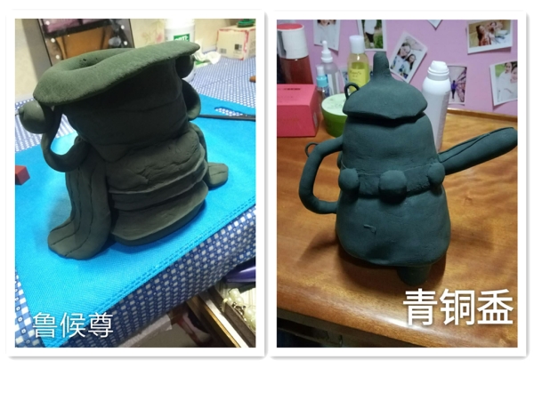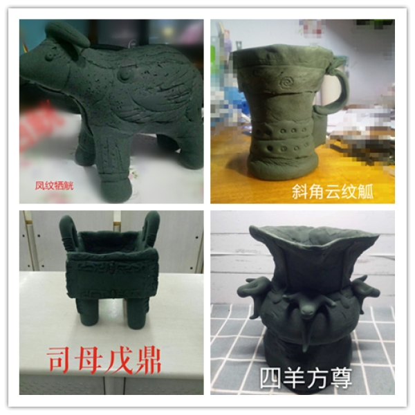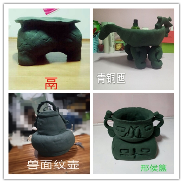 同学们借阅书籍,查找资料,认真了解所要制作的青铜器比例尺寸,从选取原料,到制作设计,再到模型制作,可以说同学们做足了功课。可在制作过程中依然遇到了没有想到的困难,一方面是原料色差大;另一方面是轻质粘泥本身凝固变形系数很大,大家花费几天时间做好的青铜器模型,到第二天早上醒来一看,面目全非,瘫倒一地,同学们惊呼唏嘘声一片。但是同学们没有灰心,再次动手,想出各种办法克服轻质黏土的弱点,杨林同学制作后母戊大方鼎,采用快递纸盒做主题支撑,郝正怡同学采用纸屑支撑器皿腹部,用筷子支撑壶嘴,通过同学们献计献策同心协力的共同努力,终于制作出成型的青铜器模型。大家兴奋不已,很有成就感。